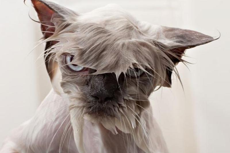 Трудно сказать, расстроен ли этот кот больше из-за того, что он мокрый, или из-за плохой прически, которую он получит, когда высохнет.