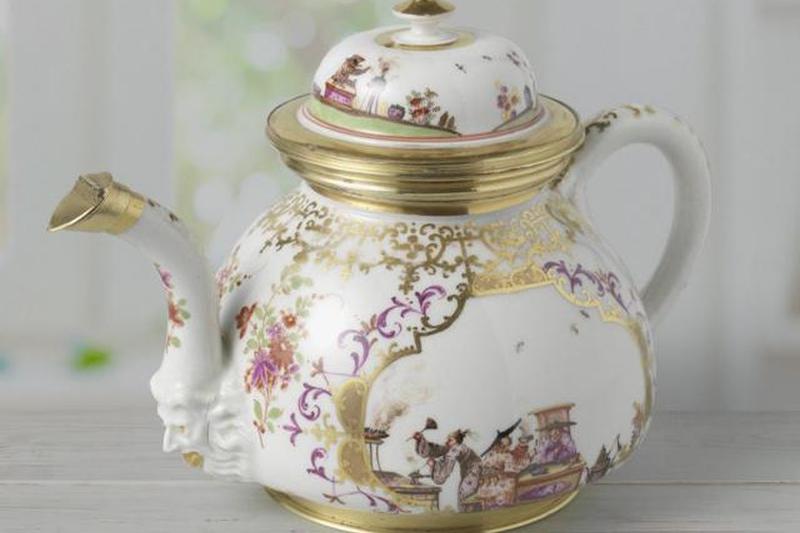 - В Метрополитен-музее в Нью-Йорке выставлен уникальный чайник Мейсена, около 1725 года. У этого необычного чайника нет верхнего отверстия. Вместо этого в основании чайника есть отверстие для наполнения. После заполнения отверстие закрывается пробкой. Детализированная сцена на этом чайнике, изображающая людей в экзотической одежде с пальмой позади них с одной стороны и людей, готовящих чай в аналогичной одежде с обратной стороны, известна как шинуазри . Этот термин относится к очень подробным и часто фантастическим сценам из жизни Востока, как это представляли европейцы.