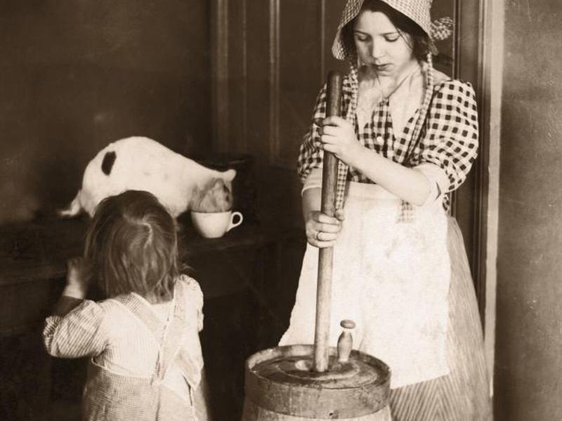 Понимание того, как работает старая маслобойка, может помочь вам узнать их в Антикварные магазины и разобраться в различных стилях. По сути, маслобойка — это сосуд, который люди использовали для приготовления масла по старинке. Чтобы использовать это, кто-то наливал сливки в маслобойку. Затем, поворачивая ручку, перемещая деревянную лопатку или рывки вверх и вниз, или перекручивая маслобойку, они будут поддерживать непрерывное движение сливок. Согласно сайту Scientific American , при перемешивании молекулы жира в сливках слипаются, образуя масло. В зависимости от количества сливок и типа сливочного масла этот процесс может занять 20 минут или больше.