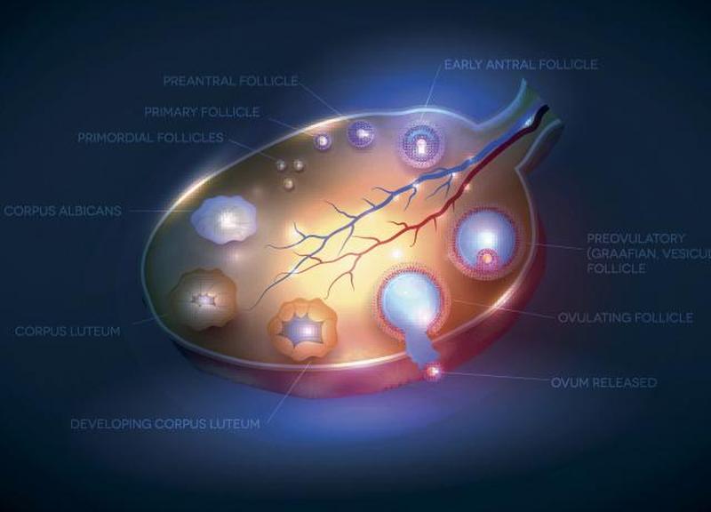 - Набор фолликулов : в конце второй половины (лютеиновая фаза) цикла или в начале первой половины (фолликулярная фаза) появляется группа (когорта) или волна синхронизированных фолликулов яичников (содержащих яйцеклетки). завербованы, чтобы расти и созревать к овуляции. Фолликул представляет собой микроскопическое скопление специализированных клеток и тканей, в которых находится яйцеклетка.