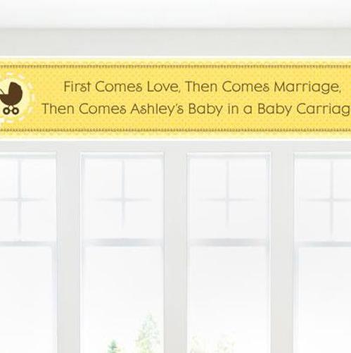 Нейтральный баннер детской коляски — этот милый баннер от BabyShowerStuff.com можно персонализировать с именем будущей мамы. Он доступен в стандартных и очень больших размерах и продается по цене от 20 до 50 долларов.