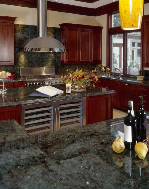 Начните с рассмотрения цвета ваших шкафов. Морилка может служить цветом в вашей дизайнерской палитре. Эффектная морилка вишневого дерева компенсируется зелено-серой каменной столешницей.