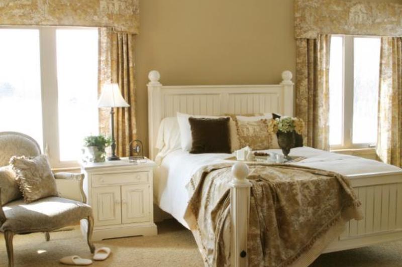 В этой французской спальне в стиле кантри используются мягкие оттенки коричневого, золотого и кремового, чтобы создать успокаивающий оазис, основанный на очаровательной ткани с узором из туалей. Непринужденная элегантность излучается расписной деревянной мебелью и простым постельным бельем.