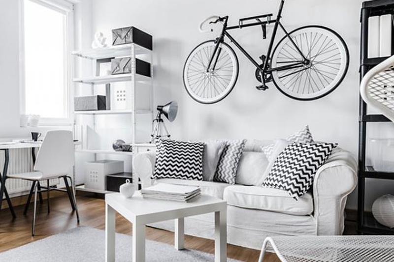 В этой гостиной цвет фона белый с черными слоями по всей комнате, что придает ей глубину и резкий контраст. Вы даже можете использовать свой велосипед как часть своего настенного рисунка, находя новое решение для хранения!