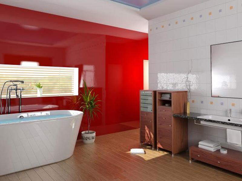 Насыщенная красная акцентная стена привносит цвет в нейтральную ванную комнату. Красный цвет повторяют красные кристаллы с вкраплениями прозрачных кристаллов в потолочной люстре. Современный туалет расположен низко и ненавязчиво. Мраморная плитка Bardiglio на полу предлагает движение и чутье.
