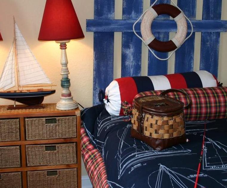 - Under the Sea — создайте подводную кровать, ведра с песком для игрушек, синие стены с изображением морских обитателей, днище лодки на потолке, пузыри и мебель из состаренного дерева.