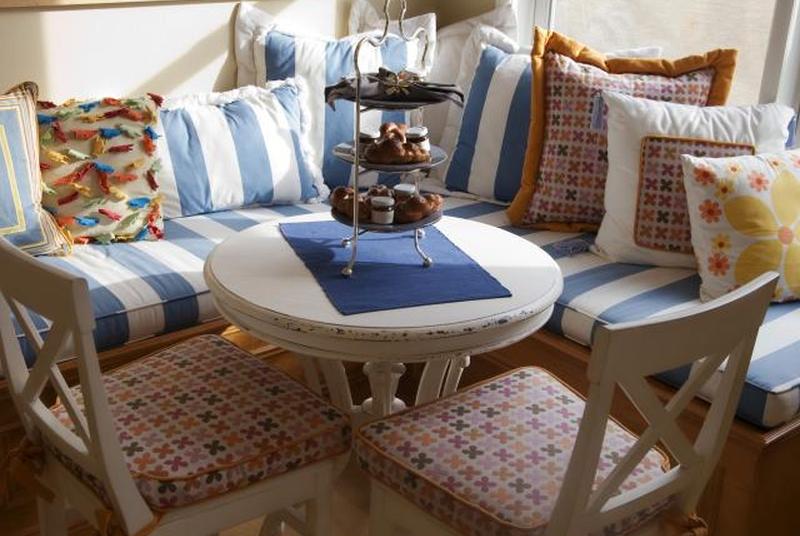 Привнесите немного морской жизни в свой завтрак с видом на пляж. Этот уголок для завтрака (на фото выше) украшен подушкой в морскую сине-белую полоску и декоративными подушками из той же ткани.