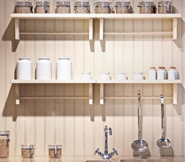 Подумайте об использовании деревенских или «старинных» полок, окрашенных в белый или кремовый цвет. Повесьте их рядом с кухонными шкафами, чтобы любые предметы на них можно было легко достать, когда это необходимо. Используйте их для демонстрации таких вещей, как специи, банки из-под печенья, свежие травы и небольшие растения, а также любые мелкие декоративные предметы, такие как старинная посуда или красочные безделушки.