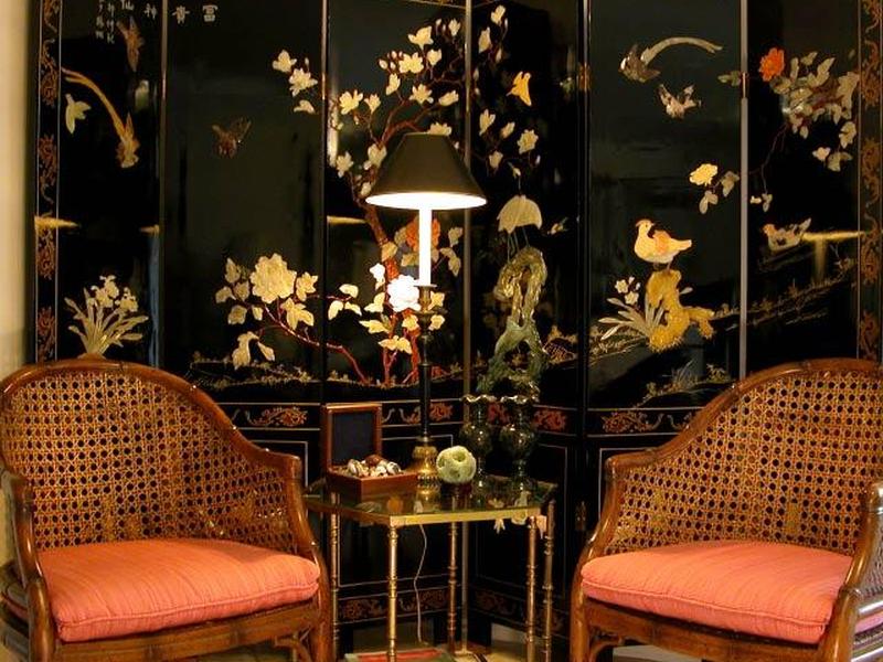 Интерьеры в китайском стиле демонстрируют смелые цвета, а также богато украшенную мебель и аксессуары. Предметы мебели, как правило, представляют собой резные деревянные конструкции с раскрашенными вручную деталями и глянцевыми лакированными поверхностями.