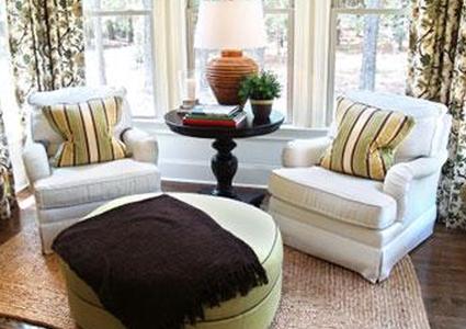 В гостиной вы можете отделить угловое пространство только для чтения с помощью небольшого коврика. Круглый ковер с парой стульев Wingback или одного шезлонга смягчит острый угол комнаты и определить пространство.