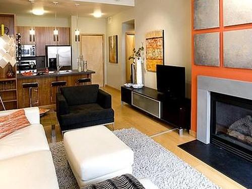 - Если каминный или развлекательный центр находится на длинной боковой стене, можно расположить группировку лицом к лицу прямо перед ним или устроить группировку на противоположной стене. Г-образный секционный диван или два кресла, поставленные рядом, также могут служить разделительной линией между двумя жилыми помещениями.