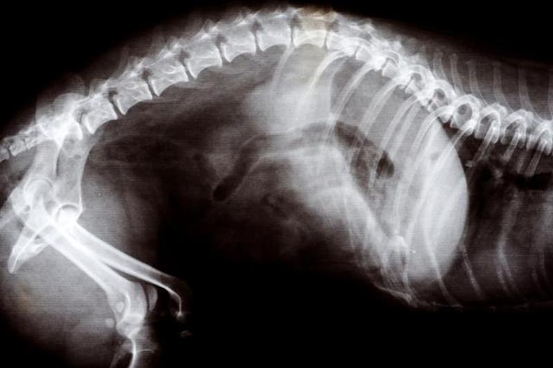 Изображение слева — это рентгеновский снимок беременной кошки на поздних сроках.