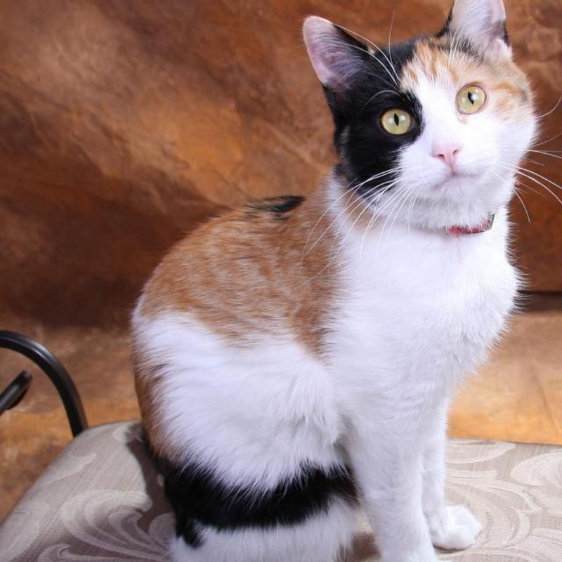 Каликосы привлекательны, даже если их Выбор породы кошек из самых популярных вариантов не полностью симметричны. Обратите внимание, как вокруг одного из глаз этой кошки шерсть темнее.