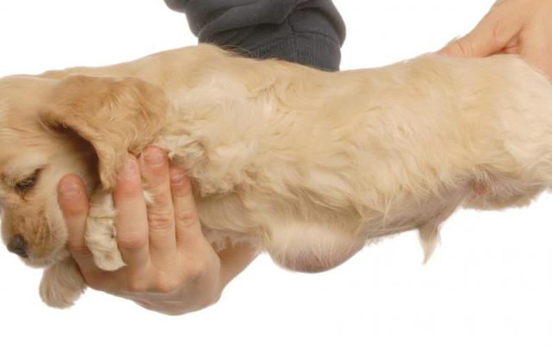 - Щенок выражает боль при прикосновении к этой области, особенно если грыжа большая.