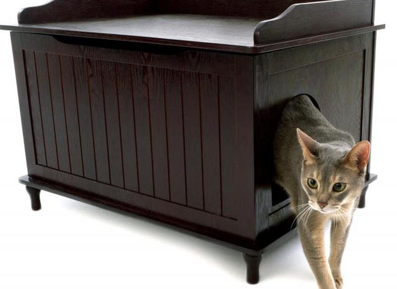 - Во-первых, убедитесь, что к мебели есть легкий доступ для смены подстилки и уборки. Хорошо подойдет небольшой шкаф с распашными дверцами, а также скамейка с откидной столешницей.