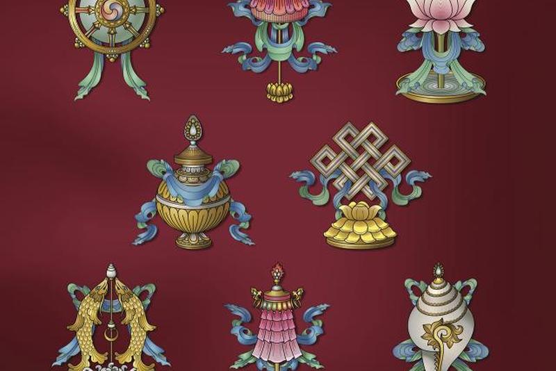 8 благоприятных символов являются популярным выбором Список амулетов на удачу для использования в приложениях фэн-шуй. Восемь буддийских символов Махаяны считаются верующими приносящими удачу. Они украшают большинство храмов и монастырей Тибета. Символы притягивают положительные энергии процветания и гармонии в дизайн фэн-шуй.