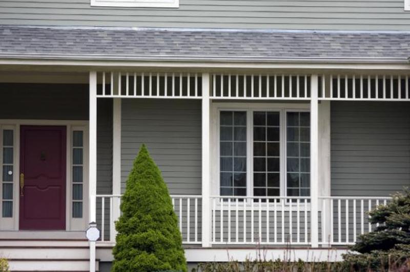 Маленькие белые колонны на крыльце этого дома резко контрастируют с темно-красным цветом этого кирпичного дома.
