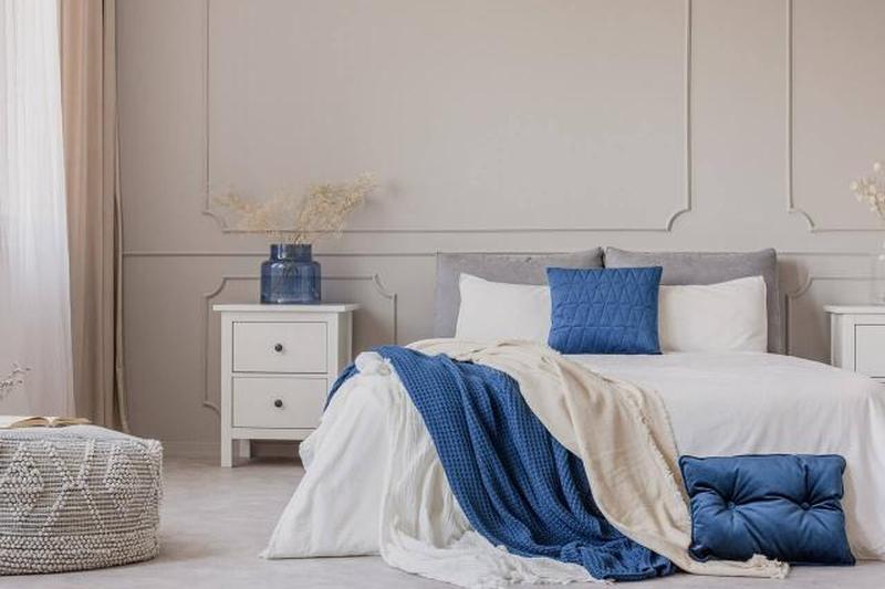 Если ваша спальня темно-синего или средне-синего цвета, добавьте более светлый синий к монохромному ансамблю постельного белья. Вы можете предпочесть три разных оттенка синего с белыми акцентами.