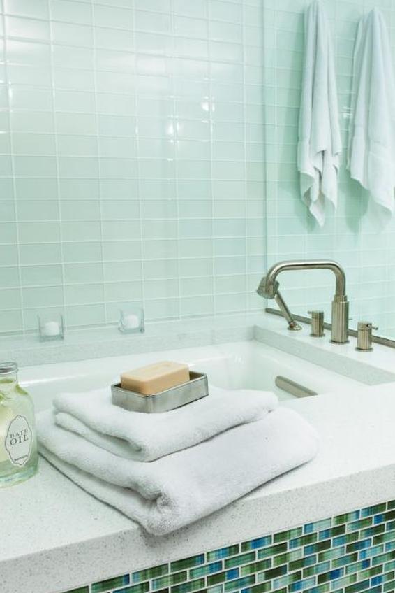 Немного обновите традиционный дизайн плитки, используя старомодные плитки по-новому. Вместо того, чтобы смещать плитки метро, попробуйте уложить их одну поверх другой для чистого, современного эффекта. Использование темного или яркого цвета еще больше модернизирует ванну.