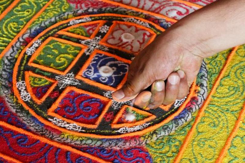Тибетцы создают мандалы из цветного песка и частично используют его, чтобы показать, насколько преходяща жизнь. Как только мандала завершена, создатели сметают ее, потому что завершение означает конец урока или цель выражения. Затем они помещают песок в проточную воду, такую как ручей, ручей или река. Затем вода несет благословения мандалы в мир.