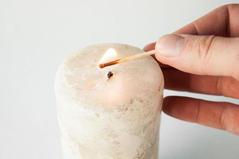 Первое, что нужно попробовать — размягчить воск феном. Это самый щадящий способ выбить зажатый фитиль. Однако, если фитиль заложен слишком глубоко, чтобы его можно было освободить путем размягчения воска, возможно, вам придется растопить окружающий воск. Идеальное решение — использовать зажигалку для барбекю, так как у нее длинный ствол и спусковой крючок, чтобы лучше контролировать пламя. Вы можете предпочесть спичку для камина, поскольку она длиннее обычной спички и дает вам больше времени, чтобы расплавить воск, если это необходимо. Кухонные спички не такие длинные, как спички для камина, но могут дать вам достаточно времени, чтобы растопить воск вокруг фитиля.