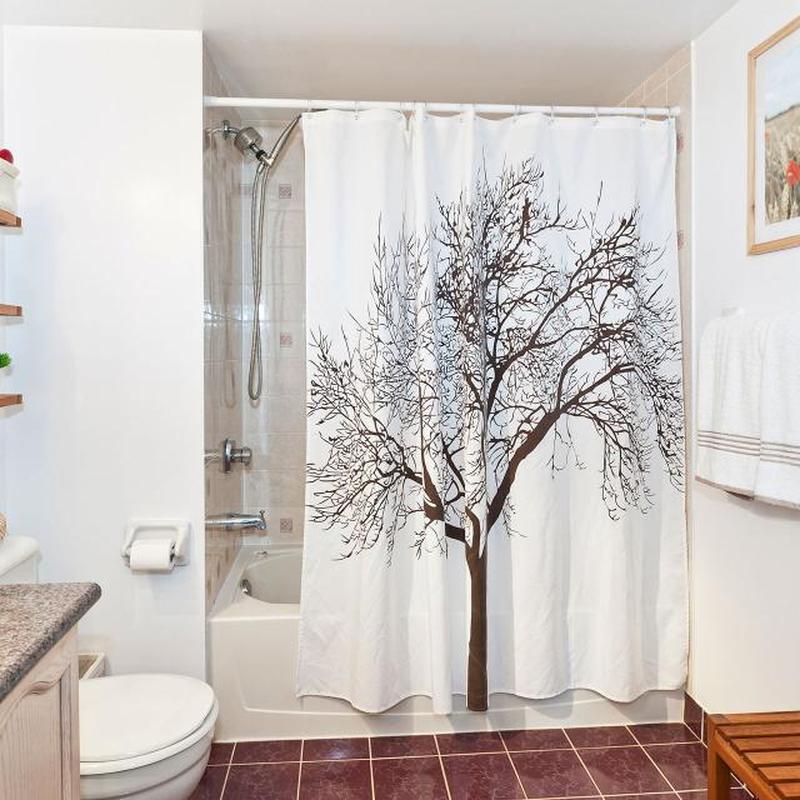 Вместо занавески попробуйте роликовую шторку. Эта уникальная идея добавит текстуру вашей ванной комнате, но также станет приятным штрихом при разработке концепции в современном или азиатском стиле. Чтобы защитить роликовую шторку от плесени, добавьте за ней прозрачную прокладку для занавески для душа и сверните ее вместе с плафоном или отложите в сторону, когда она не используется.