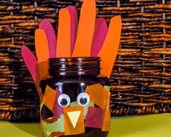 Ремесленники любого возраста могут сделать эти несложные поделки из свечей из индейки с отпечатками рук.
