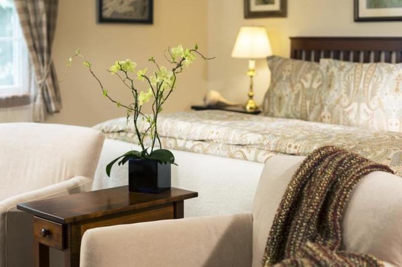 Бежевый цвет стен повторяется бежевым мягким изголовьем. Постельное белье также повторяет тот же бежевый с парой имитаций подушек, юбкой кровати и слоем постельного белья между верхней простыней и покрывалом. Сочетание кремовых подушек кремового цвета расположено между бежевыми подушками, коричневыми декоративными подушками и коричнево-синей подушкой. Хотя нет необходимости повторять бежевый цвет в постельном белье, он обеспечивает более целостный дизайн.