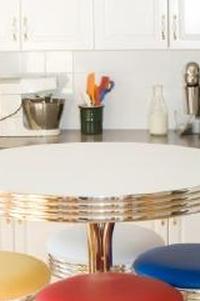 - Retro Planet предлагает девять стилей хромированных кухонных столов и стульев. Покупатель может персонализировать свой кухонный гарнитур, выбрав тип и цвет виниловой ткани для обивки стульев и цвет ламината для столешницы.