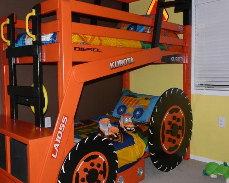 Кровать-трактор с фронтальной загрузкой понравится любому ребенку, увлекающемуся техникой, строительством или сельским хозяйством. В этой конструкции используется ведро, которое используется как ступенька к лестнице, ведущей на верхнюю койку. В ступенях ковша есть ящики для хранения. Навес над верхней койкой и два колеса на нижней койке дополняют очень аутентичный вид этой умной конструкции.