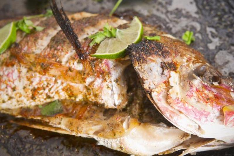 - Нафаршировать целую рыбу и запекать при температуре 450 ° F около 20 минут или дольше, в зависимости от размера. Рыба будет готовой, когда она станет непрозрачной и непрозрачной.