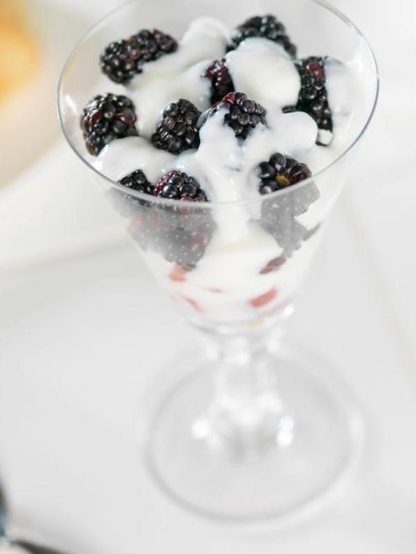 Выложите взбитые сливки и ягоды в стаканы для парфе.