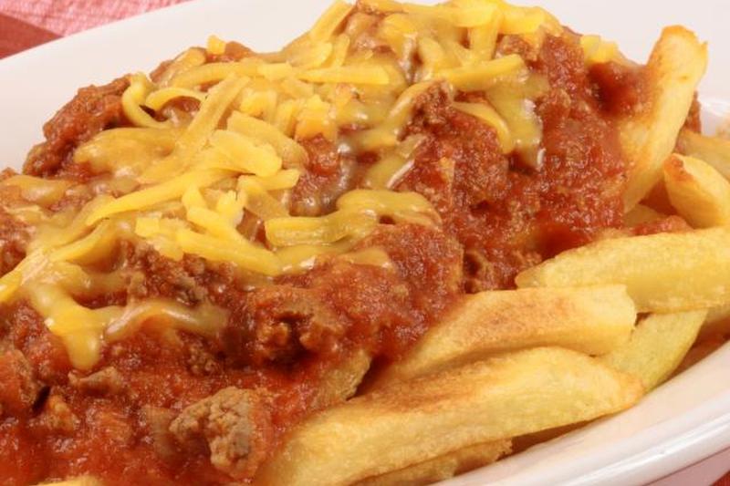 Этот картофель фри с сыром чили и пряным чоризо. Вы можете заменить гамбургер таким же количеством, если хотите уменьшить жар. Гарниры не обязательны. В рецепте 4 порции.