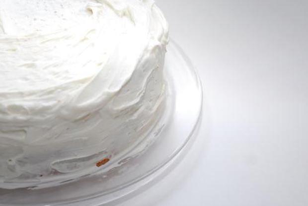 - Дайте пирогу остыть, затем заморозьте его более толстым слоем сливочного крема , начиная с нижней части торта.