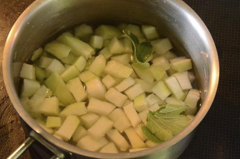 - Доведите до кипения и тушите 3 минуты или пока они не станут мягкими. Слейте воду, промокнув насухо, мелко нарежьте и отложите.