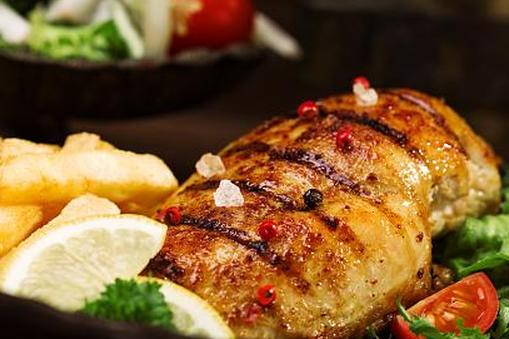 - Приготовьте курицу: обжарьте курицу на углях среднего размера по 6-7 минут с каждой стороны или до полной готовности, периодически переворачивая и смаживая оставшимися 2 столовыми ложками маринада.