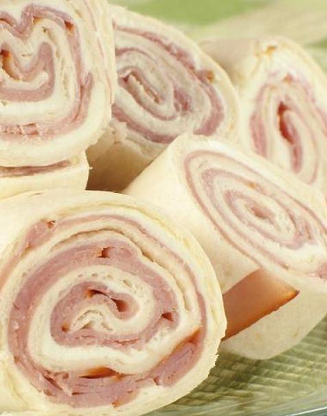 - Сверху на каждую лепешку положите два ломтика ветчины.