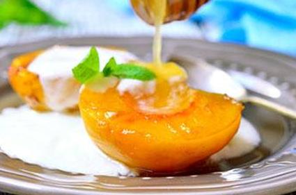 Подавать: сбрызнуть каждую половину персика 1/2 столовой ложки меда. Взбейте йогурт и корицу и положите по ложке в центр каждой половинки персика.