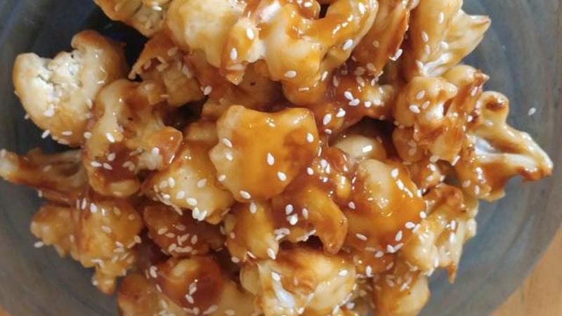Достаньте цветную капусту из духовки и полейте апельсиновым соусом.