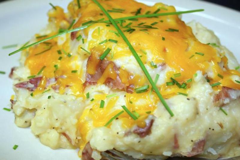 - Добавить соль и перец по вкусу, масло и сметану, перемешивая вручную. Оставьте 1/4 стакана тертого сыра и кусочки бекона для украшения. Остальное смешать с картофелем вручную. При необходимости отрегулируйте приправы.
