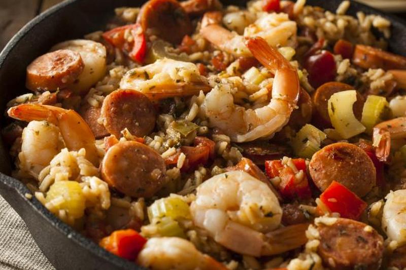 Рецепт джамбалаи с креветками и колбасой на сковороде