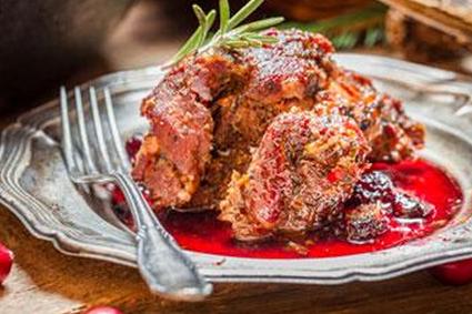 Дикая оленина (оленина), как правило, нежирная и имеет ярко выраженный привкус дичи, особенно с любыми жирами. Поэтому его обрезка перед подачей на стол может помочь удалить часть этого аромата. Клюквенный соус имеет сладко-терпкий контрапункт землистому вкусу мяса. Приготовьте оленину с жиром, чтобы она не высохла, а затем при желании подрежьте ее перед подачей на стол. Этот рецепт подходит для лося, фазана и тетерева. Подавайте его с простым гарниром, пюре из цветной капусты или жареными корнеплодами . Рецепт обслуживает двух человек.