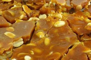 - Добавьте соду в леденец и густо разложите по смазанной маслом сковороде со слоем жареного арахиса.