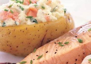 Не пропустите пикантный копченый лосось и шелковистый сливочный сыр, если их добавить в печеный картофель. На 4 порции.