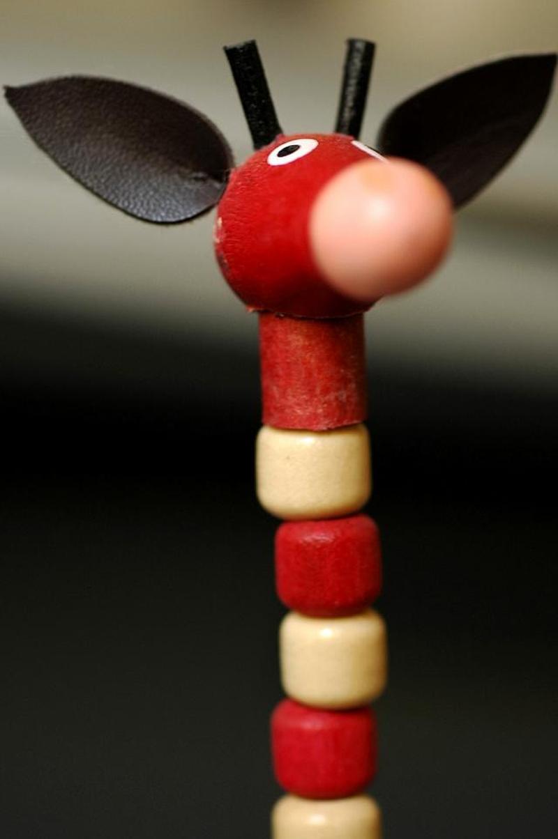 Тело жирафа представляет собой сиденье с шеей и головой впереди. Стоит на четырех колесах. Вся игрушка деревянная, за исключением синих пластиковых колес и синего тканевого шнурка спереди. Уокер в основном желтый с красными акцентами, а у жирафа игривое, улыбающееся выражение лица.