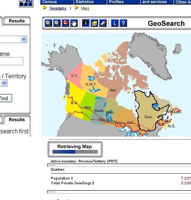 Канадский веб-сайт «Geodepot» предлагает этот интерактивный картографический инструмент, который позволяет вам щелкнуть любую часть страны Канады, и он будет обрабатывать и отображать фактические данные переписи населения этого региона страны.