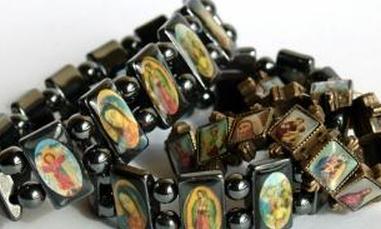 Тип религиозных украшений, которые носят многие люди католической веры, деревянные браслеты-обереги святых состоят из небольших плоских деревянных прямоугольных или овальных бусин, на каждой из которых изображен святой наверху. Как правило, изображения ламинируют или запечатывают прозрачными покрытиями, устойчивыми к воздействию ультрафиолетовых лучей солнца. Покрытие помогает гарантировать, что живописное изображение религиозных икон прослужит долгие годы.