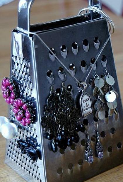 Поместите терку для сыра на комод и проденьте серьги через отверстия.