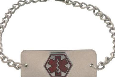 - Медицинский идентификационный браслет из нержавеющей стали представляет собой классический браслет со стандартной плоской прямоугольной металлической медицинской идентификационной табличкой, прикрепленной к браслету из звеньев цепи. Изготовленный полностью из нержавеющей стали, он подходит для мужчин и женщин и продается примерно за 28 долларов в интернет-магазине Medical ID. На лицевой стороне удостоверения есть логотип медицинского предупреждения, и вы можете выгравировать удостоверение с четырьмя строками медицинской информации с каждой стороны.