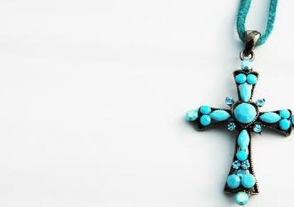 - Подвеска в виде креста из бирюзы навахо : бирюзовые овалы украшают безель этого чеканного креста из стерлингового серебра. Он поставляется с цепочкой из бисера, но есть возможность приобрести его с нитью пустынного жемчуга.